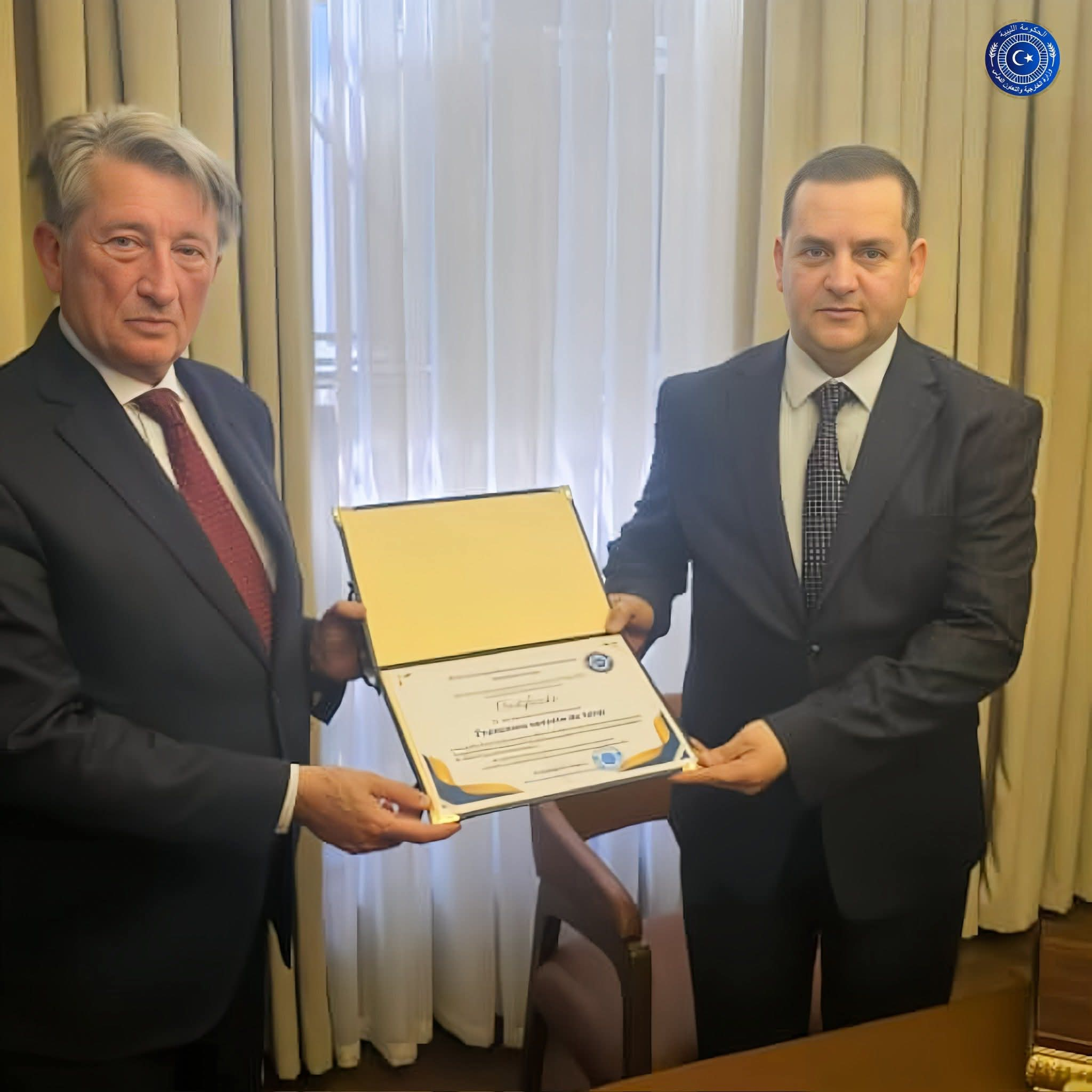 وفي هذا السياق، قام معاليه بتسليم سعادته درع الحكومة الليبية وشهادة شكر وتقدير من وزارة الخارجية والتعاون الدولي، تقديرًا لمجهوداته وإسهاماته في توطيد العلاقات الثنائية