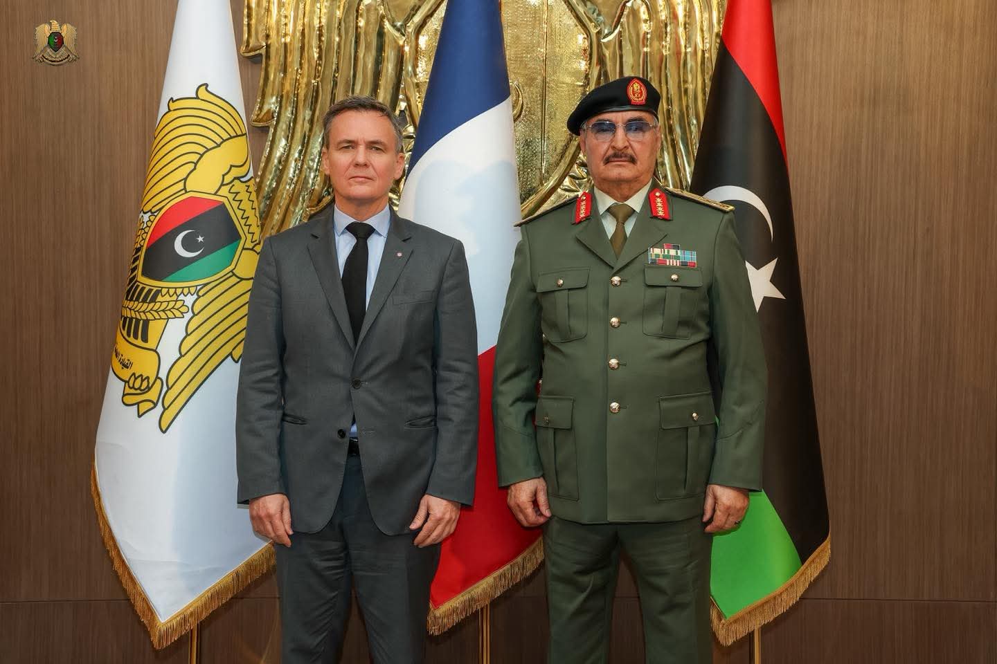 استقبل القائد العام للقوات المسلحة المشير خليفة حفتر، سفير الجمهورية الفرنسية لدى ليبيا تيري فالا، والوفد المرافق له، حيث نقل السفير تحيات الرئيس الفرنسي إيمانويل ماكرون إلى القائد العام وأفادت القيادة العامة، بأن السفير الفرنسي أكد، خلال اللقاء، حرص بلاده على استمرار تطوير العلاقات الليبية-الفرنسية وتعزيز التعاون المشترك في مختلف المجالات من جانبه، رحب القائد العام بالسفير الفرنسي، مشيرا إلى عمق العلاقات التاريخية التي تجمع ليبيا وفرنسا، ومؤكدا أهمية العمل على تطويرها بما يخدم المصالح المشتركة للبلدين وشهد اللقاء تبادلا لوجهات النظر حول آخر المستجدات على الساحة المحلية والإقليمية، إلى جانب بحث سبل تعزيز التعاون والتنسيق المشترك، لا سيما في ملفات مكافحة الهجرة غير الشرعية، والتصدي لشبكات تهريب البشر والمخدرات، بما يسهم في دعم الأمن والاستقرار في المنطقة