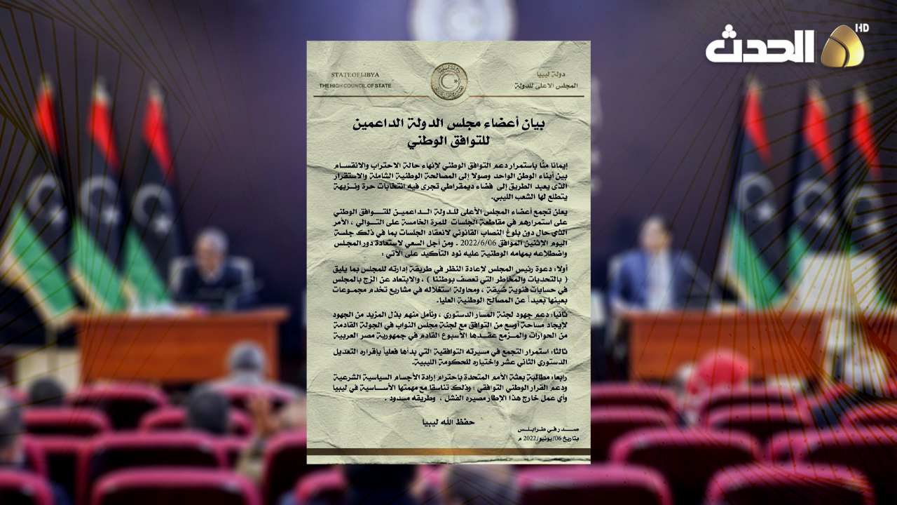 أعلن تجمع أعضاء المجلس الأعلى للدولة الـداعمين للتوافق الوطني استمرارهم في مقاطعة الجلسات للمرة الخامسة على التوالي، الأمر الذي حال دون بلوغ النصاب القانوني لانعقاد الجلسات بما في ذلك جلسة يوم أمس الإثنين وفي البيان الصارد عن الأعضاء المقاطعين قالوا : " من أجل السعي لاستعادة دور المجلس واضطلاعه بمهامه الوطنية عليه ندعو رئيس المجلس لإعادة النظر في طريقة إدارته للمجلس بما يليق بالتحديات والمخاطر التي تعصف بوطننا ، والابتعاد عن الزج بالمجلس في حسابات فئوية ضيقة، ومحاولة استغلاله في مشاريع تخدم مجمـوعات بعينها بعيداً عن المصالح الوطنية العليا " وأضافوا أيضا " ندعم جهود لجنة المسار الدستوري ، ونأمل منهم بذل المزيد من الجهود لإيجاد مساحة أوسع من التوافق مع لجنة مجلس النواب في الجولة القادمة من الحوارات والمزمع عقـدها الأسبوع القادم في جمهورية مصر " مطالبين بعثة الأمم المتحدة باحترام إرادة الأجسام السياسية الشرعية ودعم القرار الوطني التوافقي ، وذلك تناسقا مع مهمتها الأساسية في ليبيا وأي عمل خارج هذا الإطار مصيره الفشل