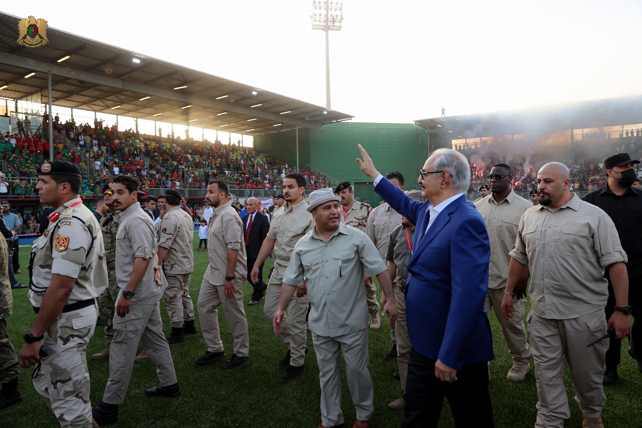 شارك القائد العام للقوات المسلحة المشير خليفة حفتر يوم الاثنين في احتفالات الذكرى الثامنة لثورة الكرامة في ملعب شهداء بنينا