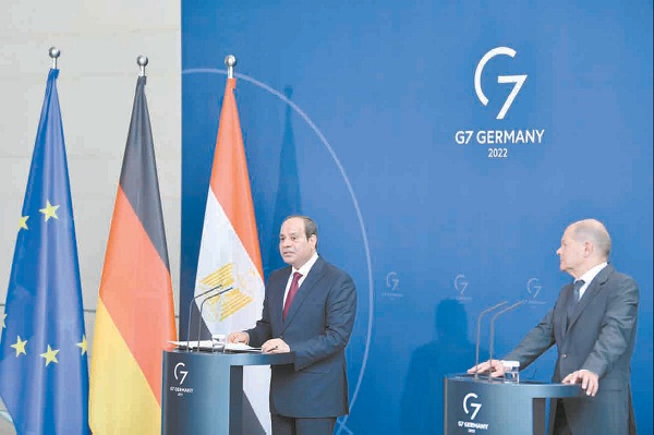 وأضاف السيسي خلال مؤتمر مع المستشار الألماني أولاف شولتس بمقر المستشارية الألمانية أن أزمة الطاقة أزمة عالمية لافتاً إلى أن التحديات الراهنة في مجال الطاقة تتطلب تعاوناً للتخفيف من آثارها