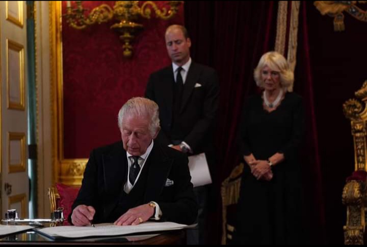 وأدى تشارلز الثالث اليمين الدستورية ملكاً على عرش بريطانيا العظمى وإيرلندا الشمالية والأقاليم الأخرى بقصر سانت جيمس وسط لندن أمام مجلس التنصيب الملكي الذي يضم رؤساء الوزراء السابقين وأعضاء المجلس الملكي الخاص ومستشاري الملك