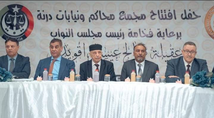 أفتتح رئيس مجلس النواب المستشار عقيلة صالح صباح يوم الخميس مقر مجمع المحاكم والنيابات بمدينة درنة، وذلك بحضور رئيس المجلس الأعلى للقضاء المستشار مفتاح عبد القوي، ومحافظ مصرف ليبيا المركزي المكلف علي الحبري، ورئيس هيئة الرقابة الإدارية السيد عبد السلام الحاسي، ونائب رئيس الحكومة الليبية علي القطراني، وعدد من اعضاء مجلس النواب ووزراء الحكومة، وعميد بلدية درنة واعيان وحكماء المدينة، وذلك بعد الانتهاء من أعمال صيانته