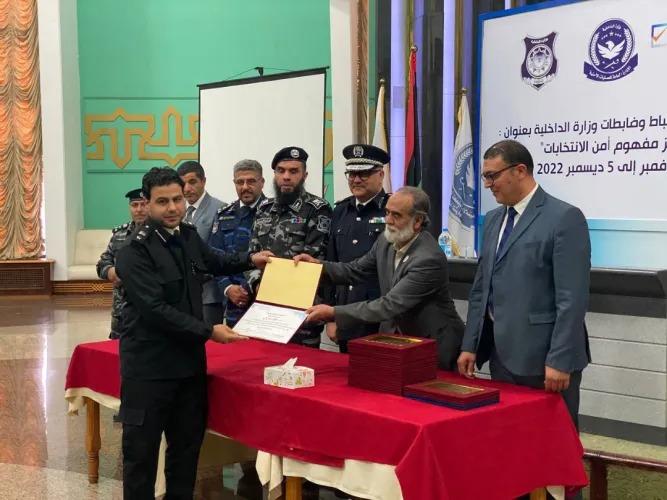 اختتمت الدورة التدريبية لضابط الشرطة المستهدفين لتأمين مراكز الاقتراع بحضور مدير الإدارة العامة للعمليات الأمنية بالمنطقة الشرقية اللواء جمال العمامي، ومدير مكتب وكيل وزارة الداخلية للشؤون الفنية اللواء علي البسباس، و معاون مدير إدارة تأمين وحماية الانتخابات عميد عماد العيساوي، و مدير فرع إدارة تأمين وحماية الانتخابات المنطقة الشرقية، و رئيس وأعضاء مكتب الإدارة الانتخابية بنغازي، و رئيس قسم التدريب والإجراءات السيد عبد الباسط النفاتي، و رئيس وحدة أمن الانتخابات بالمفوضية العميد خالد الزربوط، وعدد من الضباط المستهدفين بالتدريب، وذلك بقاعة فندق تيبستي بمدينة بنغازي