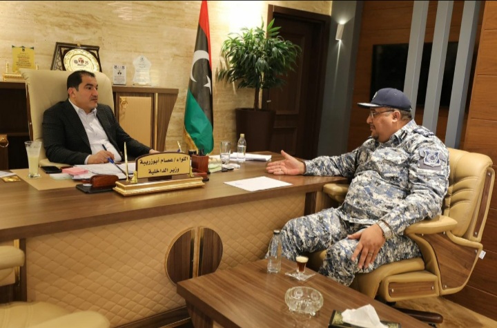 اِجتمعَ وَزير الداخلية بالحكومة الليبية اللواء عصام أبوزريبة صباح يوم الأحد، بِمُدير إدارة مُكافحة الإرهاب بِالإدارة العَامة للعمليات الأمنية بِالمنطقة الشرقية العميد نايف الحاسي وَتمَّ خِلال الاِجتماع الذي عُقد بِديوان الوَزارة مُناقشة سير العمل داخل الإدارة، وَسُبل تعاون الإدارة مع باقي الأجهزة الأمنية فِي تأمين المنافذ بِالدولة لمُكافحة الأنشطة الإرهابية وَضبط مُرتكبيها وَاِستمعَ الوَزير مِن مُدير الإدارة إلى شروح وافية حول آلية عمل الإدارة وَالمهام المُناطة بِها فِي مُكافحة الإرهاب، وَالآليات التي اُتخذت للتَنسيق معَ الأجهزة الأمنية الأخرى، مُشدداً على ضرورة بذل المزيد مِن الجهد وَالتحلي بِاليقظة فِي مُواجهة أي تَهديدات أمنية تمُس أمن الدولة، مُتعهداً بِتذليل كل المعُوقات وَالمصاعب التي تواجههم فِي أداء عملهم الوطني الهَام