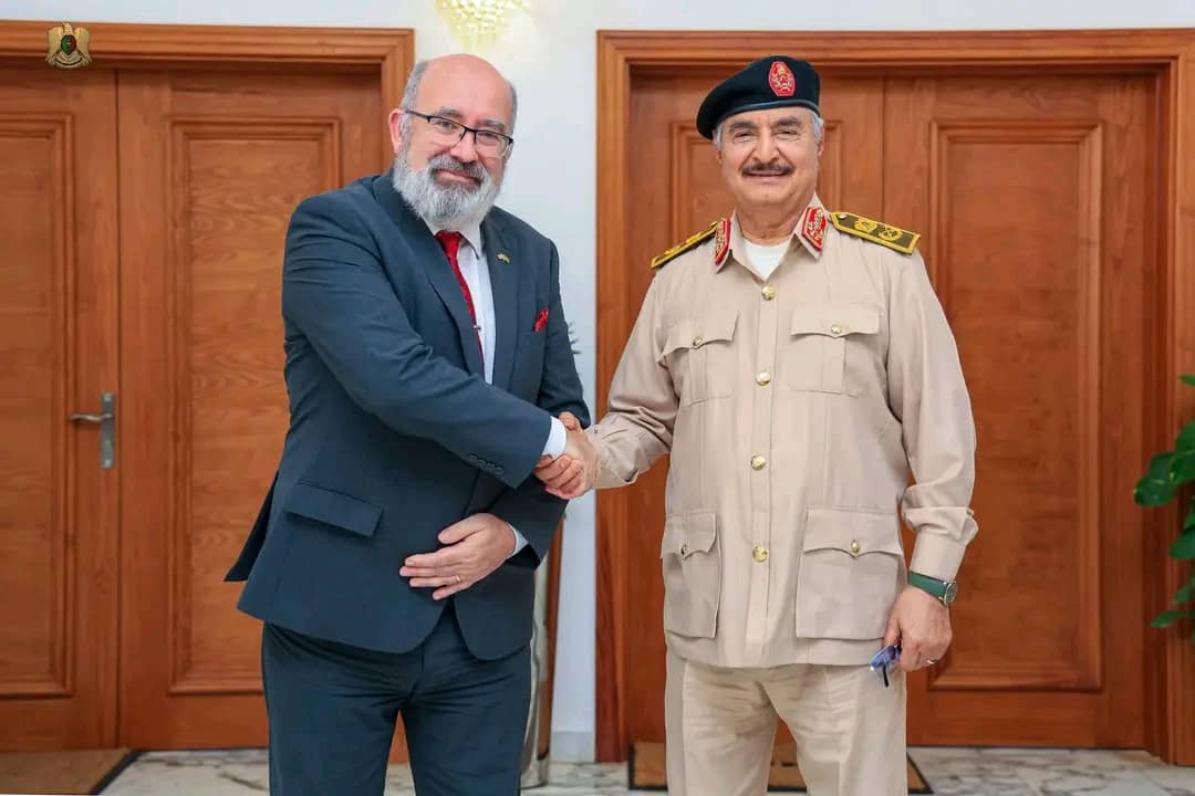 استقبل القائد العام للجيش الوطني الليبي المشير خليفة حفتر بمكتبه بمقر القيادة العامة في بنغازي، السفير البريطاني لدى ليبيا مارتن أندرو والوفد المرافق له