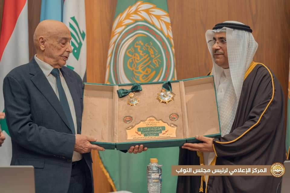 كرم البرلمان العربي، رئيس مجلس النواب المستشار عقيلة صالح، بوسام التميز العربي، تقديرًا لجهوده الفعّالة والمتميزة في إدارة البرلمان الليبي، إذ تم التكريم خلال الجلسة العامة الرابعة للبرلمان العربي، في إطار الفصل القانوني الثالث له عُقدت في القاهرة، بحضور أعضاء مجلس النواب حسن البرغوثي وعلي كشير وأبو صلاح شلبي وأحلام اللافي، مؤلف ديوان مجلس النواب عبد الله المصري الجديد الهيئة الإدارية عبد الله قادربوه، والقائمون على الشهادة الشرعية بالقاهره محمد عبد العالي، والمستشار الإعلامي لمجلس النواب عبد الحميد الصافي هذا وقد أثنى رئيس التمثيل العربي عادل بن عبد الرحمن العسومي، في كلمته خلال نيل التكريم، على دور المستشار عقيلة صالح كقيادي برلماني وطني وقومي، وصفاً التكريم له للمساهمة لخمسة رئيس مجلس النواب الليبي في الحفاظ على القيم العربية للخطوط البرلمانية على الصعيدين الوطني والعربي وبدوره، دعا رئيس مجلس النواب الليبي، الليبيين جميعاً إلى التعاون والوحدة وإنهاء الخلافات وتأليف القلوب والسير معاً لإنشاء مؤسسات في ليبيا، واختر أن الوحدة هي طريق الحق، بينما طريق الشيطان هوالخلاف