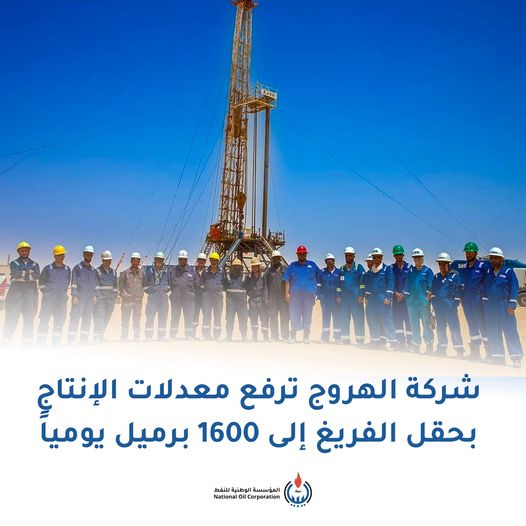 فازت المؤسسة الوطنية للنفط بنجاحها في رفع إنتاج البئر AA-10 لجميع أعمال الفريغ بامتياز آمال من 250 تشغيلاً يومياً إلى 1600 يومياً بشكل مبدئي قابل للزيادة بعد صعود كافة على البئر وبربرت على صفحتها الرسمية على فيس بوك شكرها وتقدرها لمسؤولي شركة الهروج وكافة العاملين في مواقع مختلفة، لجهودهم المضنية في إنجاز هذا العمل والمساهمة في رفع الإنتاج