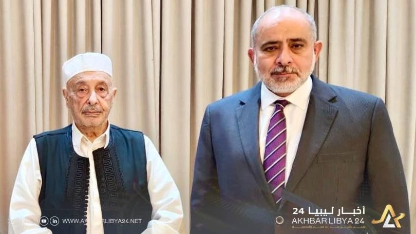 عقيلة صالح مع رئيس (تكتل إحياء ليبيا) عارف علي النايض، في مقر المجلس بمدينة