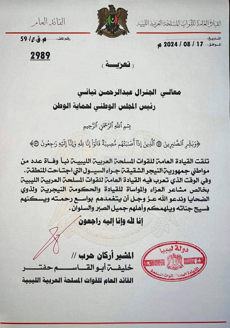الليبية، المشير خليفة حفتر، برقية تعزية ومواساة إلى رئيس المجلس الوطني لحماية