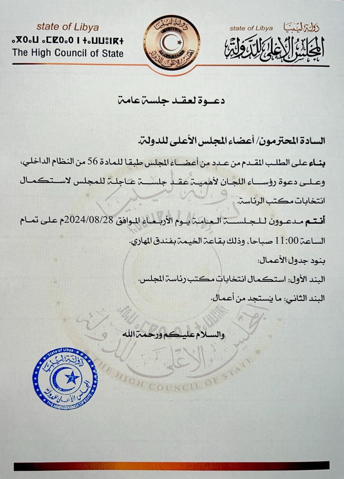 دعا مجلس الدولة الاستشاري أعضاء المجلس إلى جلسة عامة عاجلة يوم الأربعاء المقبل لاستكمال انتخابات مكتب رئاسة المجلس.