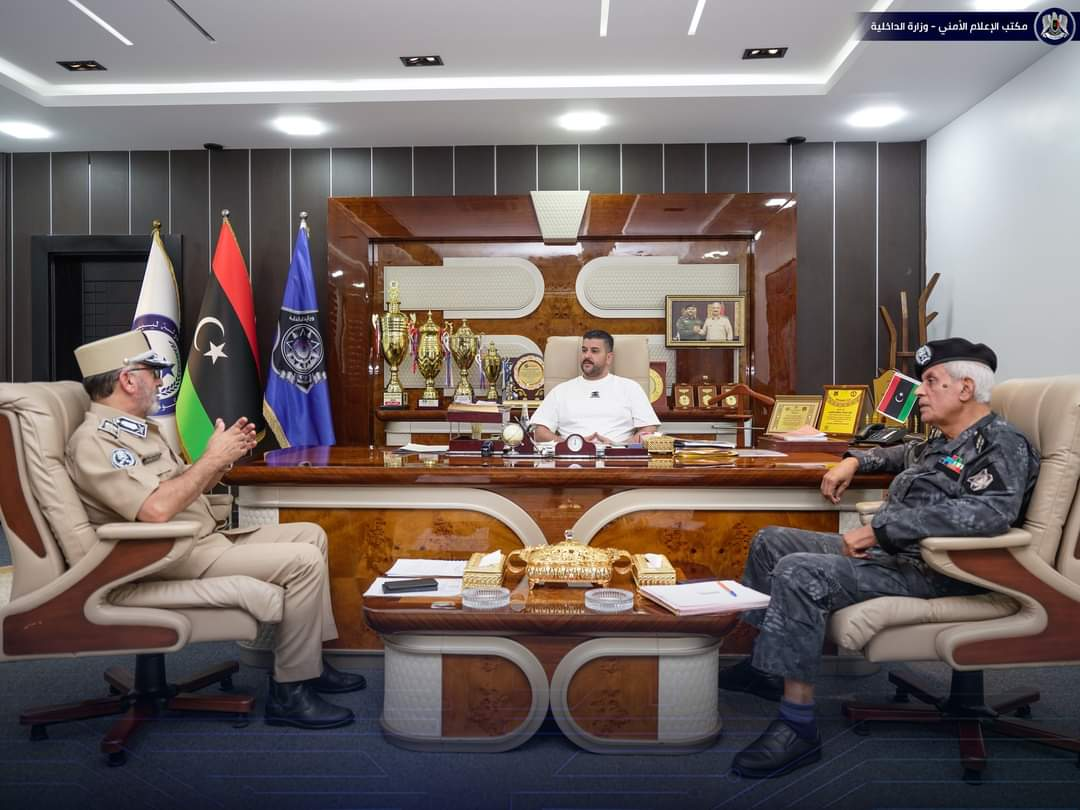 بحث وكيل وزارة الداخلية بالحكومة الليبية لواء فرج اقعيم، جملةً من التفاصيل الأمنية المتعلقة بعمل الإدارة العامة للأمن الدبلوماسي، وذلك خلال لقائه بمدير الإدارة لواء زياد الحاسي تخلّل الاِجتماعَ نقاشاتٌ موسّعة حول تأمين البعثات الدبلوماسية والسفارات والقنصليات على الأراضي الليبية، وأبرز المعوّقات التي تواجه إدارة الأمن الدبلوماسي في عملها، وأنسب الوسائل لمعالجتها