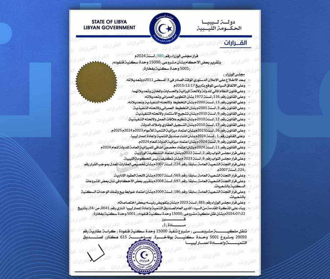 أصدر مجلس وزراء الحكومة الليبية اليوم القرار رقم 380 لسنة 2024م، بتقرير بعض الأحكام بشأن مشروع 15000 وحدة سكنية قنفودة، و5001 وحدة سكنية بوفاخرة القرار نص في مادته الأولى على نقل ملكية المشروعين المذكورين حسب الأوصاف العقارية الواردة به إلى صندوق التنمية وإعادة إعمار ليبيا وأذِن في المادة الثانية لصندوق التنمية وإعادة إعمار ليبيا بمباشرة إجراءات التعاقد على استكمال المشاريع المذكورة في المادة رقم 1 وفقاً للدراسات الهندسية والفنية المعتمدة لدى الصندوق وفي المادة الثالثة من القرار تم تكليف صندوق التنمية وإعادة إعمار ليبيا بالإشراف على تنفيذ برامج بيع وتخصيص الوحدات السكنية، ووضع الشروط المتعلقة بتخصيصها وقيمتها ومتابعة الإجراءات المتعلقة بذلك