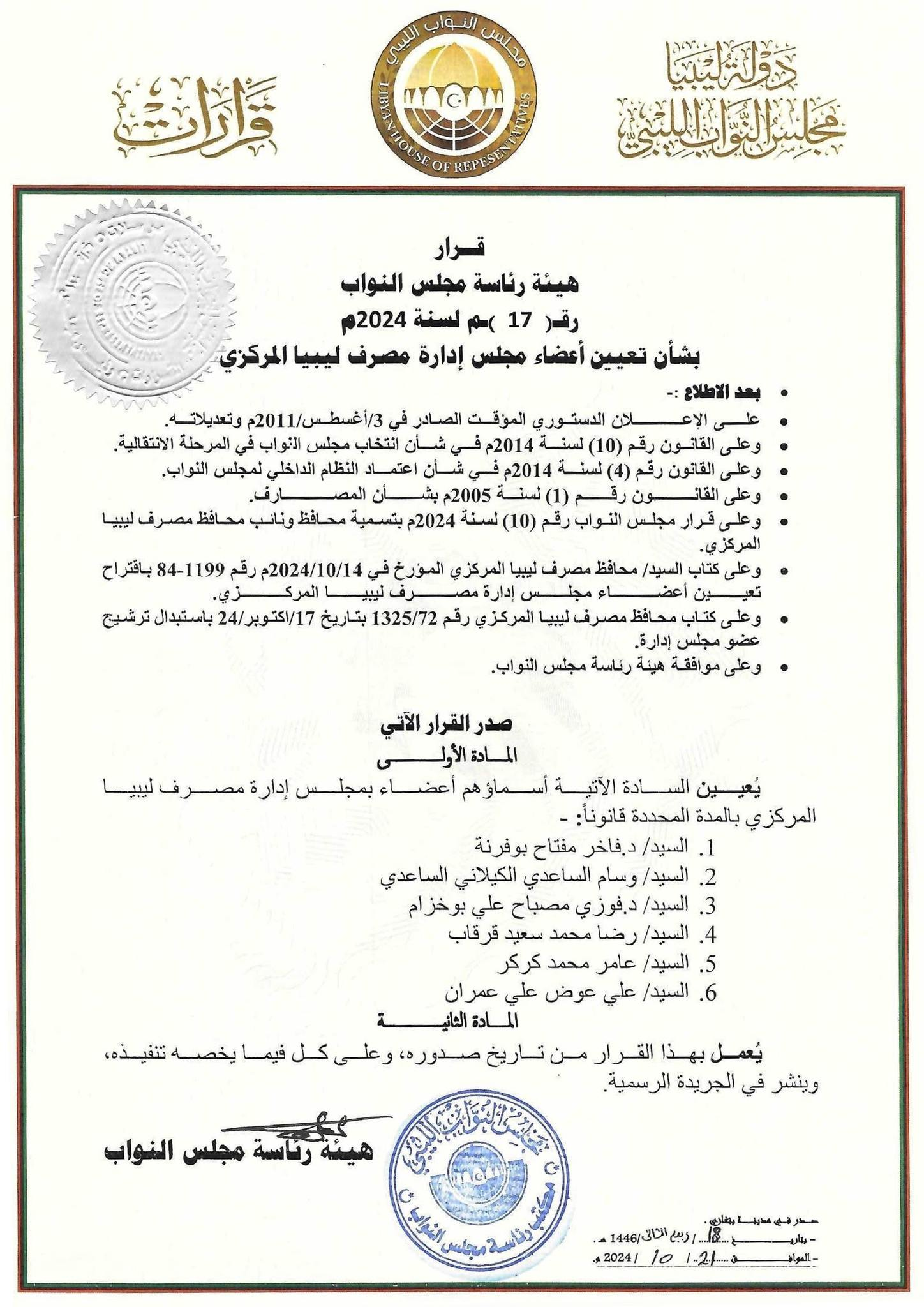 أصدرت هيئة رئاسة مجلس النواب قرارا بتعيين أعضاء مجلس إدارة مصرف ليبيا المركزي بالمدة المحددة قانونا، أي ثلاث سنوات وفق القانون رقم 1 للعام 1993 بشأن المصارف والنقد والائتمان.