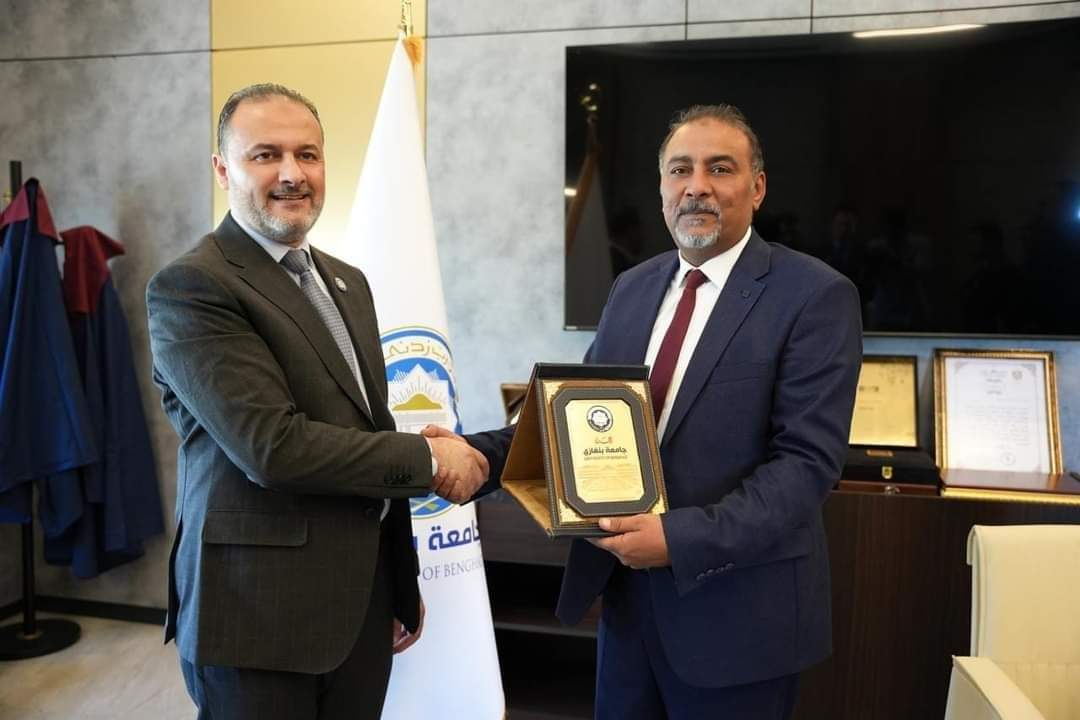 أجرى وزير الأشغال العامة بالحكومة الليبية المهندس نصر شرح البال العبيدي زيارة رسمية إلى مقر الإدارة العامة لجامعة بنغازي وكان في استقباله رئيس جامعة بنغازي الدكتور عزالدين الدرسي ووكيل الجامعة لشؤون المجتمع والبيئة يحيى لملوم وعدد من وكلاء وعمداء الجامعة وخلال الزيارة عقد الوزير اجتماعا تشاوريا مع رئيس جامعة بنغازي لمناقشة إعداد مذكرة تفاهم لتجميع بيانات من بيت الخبرة في جامعة بنغازي لتحقيق وإرساء قواعد التنمية المستدامة في كافة ربوع البلاد وتم خلال الاجتماع الاتفاق على تشكيل فريق يمثل وزارة الأشغال العامة وجامعة بنغازي وذلك للبدء في تنفيذ صياغة المذكرة المتفق عليها بين الطرفين وأبدى رئيس الجامعة رغبته في اتخاذ خطوات جدية لتنفيذ المذكرة على أرض الواقع وأكد الوزير أنه من خلال هذا الاتفاق يمكن تجميع بيانات حقيقية للمشاريع التنموية التي تشهدها أغلب المدن بالمنطقة الشرقية والجنوبية مضيفا أن هذه البيانات ستكون قاعدة لإرساء التنمية المستدامة على المدى الطويل