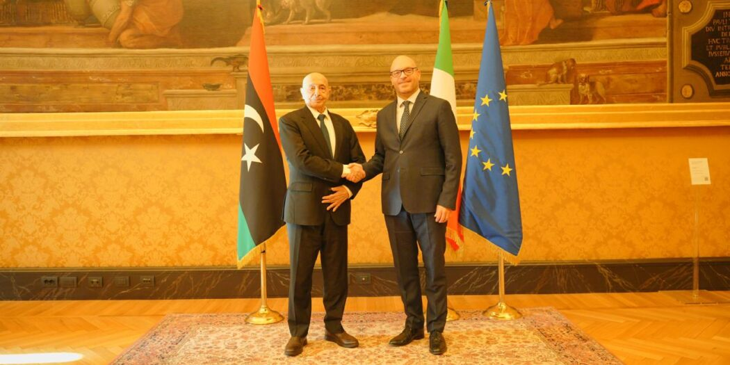 وصل رئيس مجلس النواب المستشار ” عقيلة صالح ” رفقة وفد برلماني يضم السادة أعضاء مجلس النواب” أحمد الشارف ، الصادق الكحيلي ، اسمهان بالعون ” إلى العاصمة الإيطالية روما، وذلك بناءً على دعوة رسمية من مجلس النواب الإيطالي ، حيث التقى رئيس مجلس النواب عقب وصوله، رئيس مجلس النواب الإيطالي لورينزو فونتانا، الذي بدوره رحب رئيس مجلس النواب والوفد المرافق له بحضور السفير الليبي في روما مهند يونس ، مؤكدا رغبته في الاستماع من رئيس مجلس النواب لآخر المستجدات في ليبيا