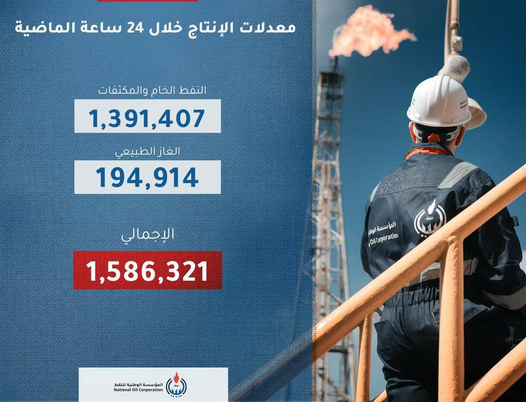 أعلنت المؤسسة الوطنية للنفط عن تحقيق زيادة ملحوظة في إنتاج النفط الخام والمكثفات حيث ارتفع الإنتاج بمعدل 5,377 برميل، ليصل الإجمالي إلى 1,391,407 برميل يوميًا