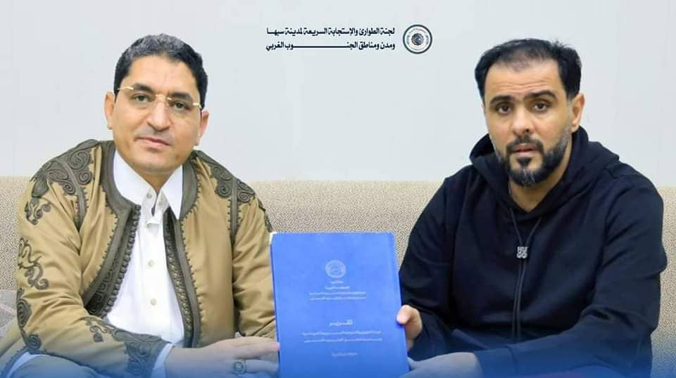 استلم رئيس مجلس الوزراء الدكتور أسامة حماد، التقرير النهائي للجنة الطوارئ والاستجابة السريعة لمدينة سبها ومدن ومناطق الجَنُوب الغربي، من رئيس اللجنة، وزير العمل والتأهيل عبد الله أرحومة وأكد رئيس الحكومة، على حرصه في متابعة جميع أعمال اللجنة بشكل يومي، مشيرًا إلى الجهود الكبيرة التي بذلها الوزير عبد الله أرحومة في رئاسة اللجنة والعمل المتواصل لضمان وصول المساعدات إلى المستحقين وإتمام كافة المهام المناطة بها كما وجه رئيس الحكومة الشكر لجميع أعضاء اللجنة والمؤسسات التي ساهمت في إنجاح أعمالها بدوره، تقدم الوزير أرحومة بالشكر إلى القيادة العامة بقيادة المشير خليفة حفتر، وكذلك إلى رئيس مجلس الوزراء الدكتور أسامة حماد، على الثقة والدعم المستمر لأعمال اللجنة، مُعربًا عن امتنانه المساعدات المستمرة لمدن الجَنُوب الغربي، خاصة في أعقاب السيول والأمطار التي اجتاحت المنطقة في سبتمبر الماضي تتضمن التقرير النهائي للجنة الطوارئ والاستجابة السريعة، الذي تم تسليمه، كافة الأنشطة التي تم تنفيذها من قبل اللجنة، بالإضافة إلى التوصيات الخاصة بالمشروعات الاستراتيجية واحتياجات المناطق والقرى في الجَنُوب الغربي