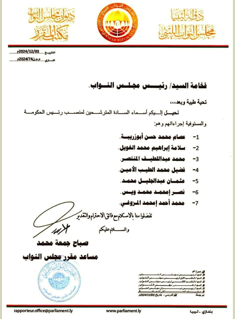 استلم رئيس مجلس النواب عقيلة صالح قائمة بأسماء المترشحين لمناصب رئيس الحكومة والمستوفية إجراءاتهم والتي تضمنت 7 من أسماء المترشحين لمناصب رئيس الحكومة الأسماء : عصام أبوزريبة ، سلامة الغويل ، محمد المنتصر ، فضيل الأمين ، عثمان عبدالجليل ، نصر ويس ، محمد المزوغي