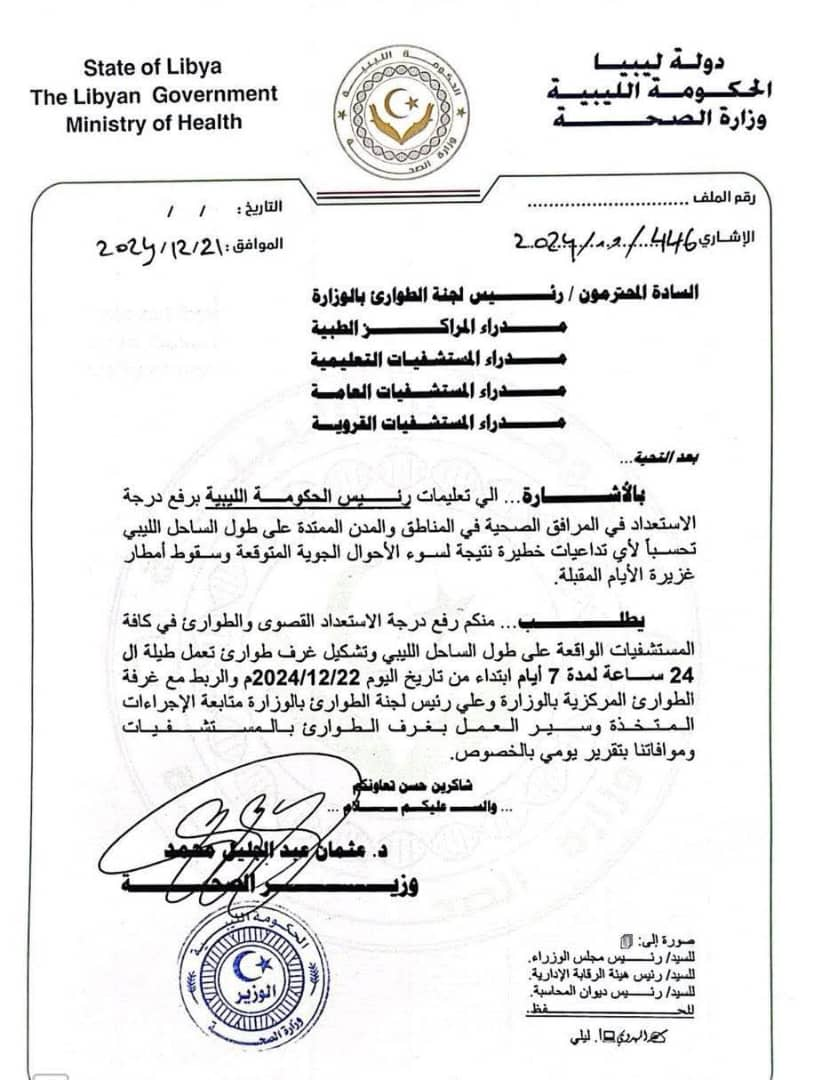 الحكومة الليبية ترفع الجاهزية في المستشفيات تحسبًا لسوء الأحوال الجوية