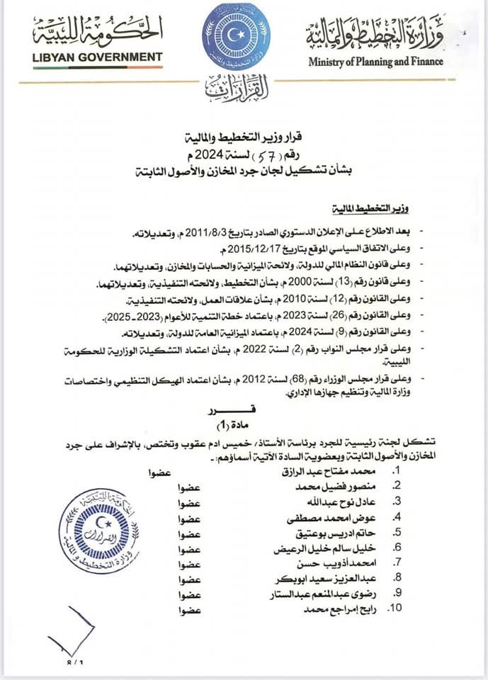 صدر وزير التخطيط والمالية أسامة حماد قرار رقم (56) بخصوص تشكيل لجان الجرد السنوي للخزائن والحسابات المصرفية وقرار رقم (57) بشأن تشكيل لجان الجرد الرئيسية والفرعية للمخازن والأصول الثابتة للجهات الممولة من الخزانة العامة وتشكيل 21 لجنة فرعية تتبع اللجنة الرئيسية