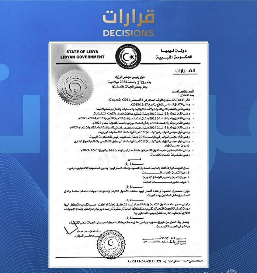أصدر رئيس مجلس وزراء الحكومة الليبية، الدكتور أسامة حماد، قرارًا بحل كل من جهاز تنمية وتطوير المدن، وجهاز تنمية وتطوير المراكز الإدارية، وهيئة المشروعات العامة التابعة لصندوق التنمية وإعادة إعمار ليبيا، مع إنهاء شخصيتها الاعتبارية