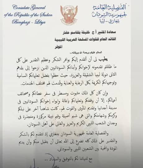 قدّم القنصل العام السوداني شكره وتقديره وامتنانه إلى القائد العام للقوات المسلحة المشير خليفة حفتر، وذلك تقديرًا للمجهودات التي بذلها في دعم اللاجئين السودانيين أثناء فترة نزوحهم بسبب الحرب في السودان