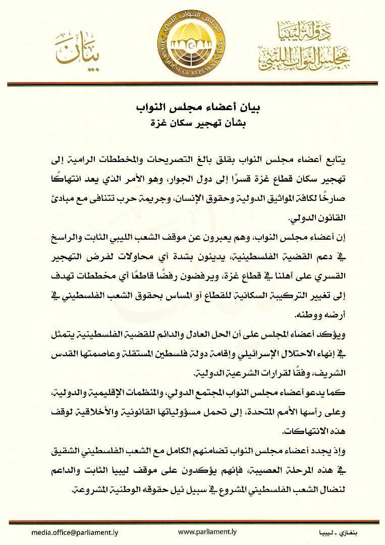 وطالب أعضاء مجلس النواب المجتمع الدولي والمنظمات الدولية، وعلى رأسها الأمم المتحدة، بتحمل مسؤولياتها لوقف هذه الانتهاكات وحماية حقوق الشعب الفلسطيني، مؤكدين على تضامنهم الكامل مع الشعب الفلسطيني في ظل الظروف الراهنة