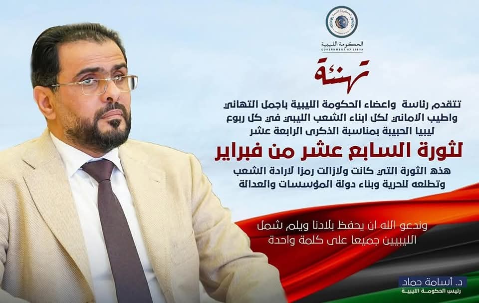 وأكدت الحكومة، في تهنئة رئيس الحكومة أسامة حماد، أن هذه الثورة تظل رمزًا لإرادة الشعب الليبي وتطلعه للحرية وبناء دولة المؤسسات والعدالة