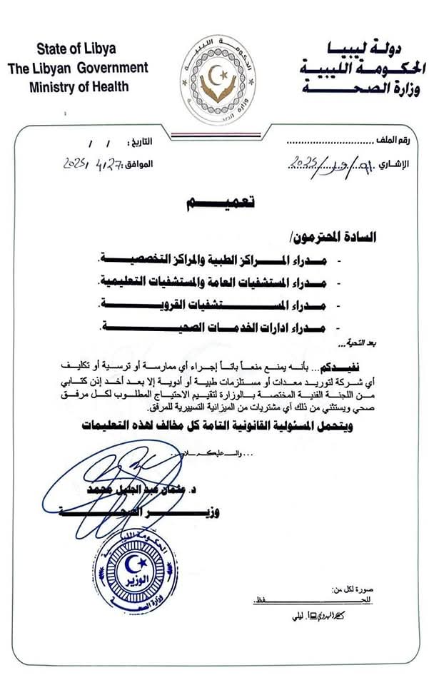أصدرت وزارة الصحة بالحكومة الليبية تعميمًا موجهًا إلى كافة مدراء المراكز الطبية والمراكز التخصصية، ومدراء المستشفيات العامة والمستشفيات التعليمية، ومدراء مستشفيات العزل، بالإضافة إلى مدراء إدارات الخدمات الصحية بالمناطق وأكد التعميم على منع اتخاذ أي إجراءات أو ممارسات أو توصيات أو تكليفات تتعلق بإبرام عقود توريد أو مستلزمات أو مستندات مالية إلا بعد الحصول على إذن كتابي رسمي من الوزارة واللجنة الفنية المختصة، كما شددت الوزارة على ضرورة التقيد الكامل بهذه التعليمات، محذرة من أن أي مخالفة ستعرض مرتكبها للمساءلة القانونية الكاملة ويأتي هذا التعميم في إطار جهود وزارة الصحة لتنظيم الإنفاق المالي والحرص على ترشيد المصروفات، وضمان الشفافية وحسن إدارة الموارد العامة