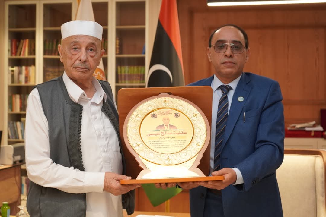 التقى فخامة رئيس مجلس النواب المستشار عقيلة صالح، محامي عام مدينة البيضاء المستشار جبر عبدالرحمن الشريف رفقه أعضاء مكتبه فخامته، وخلال اللقاء الذي عقده بمكتبه في مدينة القبة، بحث عددا من الملفات في الشق القانوني والقضائي ومن ضمنها ما يتعلق بالسجون والهجرة غير الشرعية ودور النيابات في كيفية فرض القانون والصعوبات التي تواجه عمل النيابات وخلال اللقاء، شدد فخامة رئيس على ضرورة القضاء على آفة المخدرات، والضرب بيد من حديد لكل من تسول له نفسه العبث بأمن البلاد، مثمنا دور النيابات الإيجابي في خلق الردع الخاص والعام هذا وقد أشاد فخامة رئيس مجلس النواب، بعمل مكتب المحامي العام والنيابات التابعة له وفي ختام اللقاء قدمّ المستشار المحامي العام بمدينة البيضاء درع تكريمية لفخامة الرئيس نظيرا لدعمه اللامحدود لكافة الجهات القضائية في البلاد