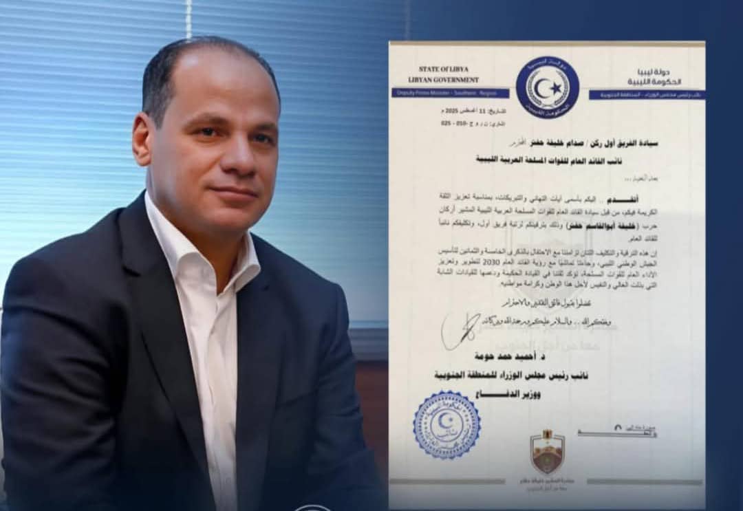 وأكد الدكتور حومة، في بيان رسمي، أن هذه الترقية والتكليف، والتي تزامنت مع الذكرى الخامسة والثمانين لتأسيس الجيش الوطني الليبي، تُجسّد رؤية القائد العام 2030، الهادفة إلى تطوير المؤسسة العسكرية وتعزيز أدائها بما يخدم سيادة الدولة واستقرارها
