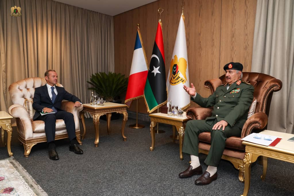 استقبل القائد العام للقوات المسلحة، المشير أركان حرب خليفة أبوالقاسم حفتر، المبعوث الخاص للرئيس الفرنسي، بول سولير، في مكتبه بمقر القيادة العامة - الرجمة، حيث نقل تحيات الرئيس الفرنسي "إيمانويل ماكرون" للقائد العام والشعب الليبي