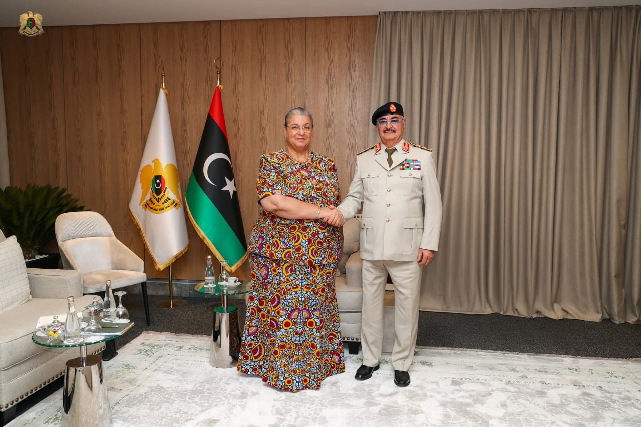 استقبل القائد العام للقوات المسلحة، المشير أركان حرب خليفة حفتر، بمكتبه في مقر القيادة العامة، رئيسة بعثة الأمم المتحدة للدعم في ليبيا، حنا تيتيه، والوفد المرافق لها وبحث الجانبان خلال اللقاء خارطة الطريق التي قدمتها البعثة الأممية في إحاطتها أمام مجلس الأمن بتاريخ 21 أغسطس 2025م، وآليات دعم المسار السلمي للعملية السياسية، بما يهدف إلى إجراء الانتخابات الرئاسية والبرلمانية في البلاد كما تطرق اللقاء إلى مناقشة السبل الكفيلة بمنع تفاقم التوتر الأمني في طرابلس، بما يضمن أمنها واستقرارها ويحافظ على سلامة سكانها ومرافقها العامة والخاصة