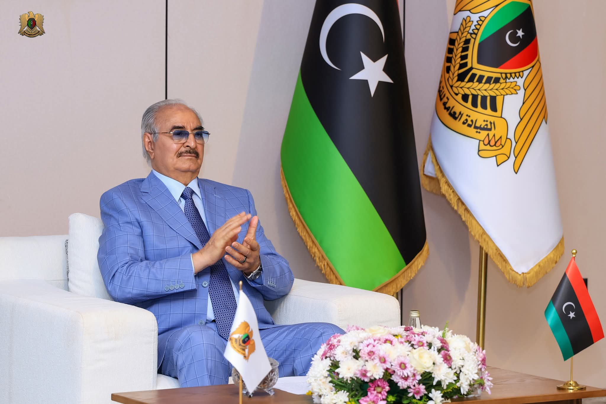 وأشار المشير حفتر إلى أن حلّ الأزمة الليبية يجب أن ينبع من إرادة الشعب الليبي وبمساندة القبائل، بعيدًا عن أي تدخلات أو مبادرات خارجية، مشددًا على أن وحدة الوطن وسلامة أراضيه تبقيان في مقدمة أولويات القيادة العامة