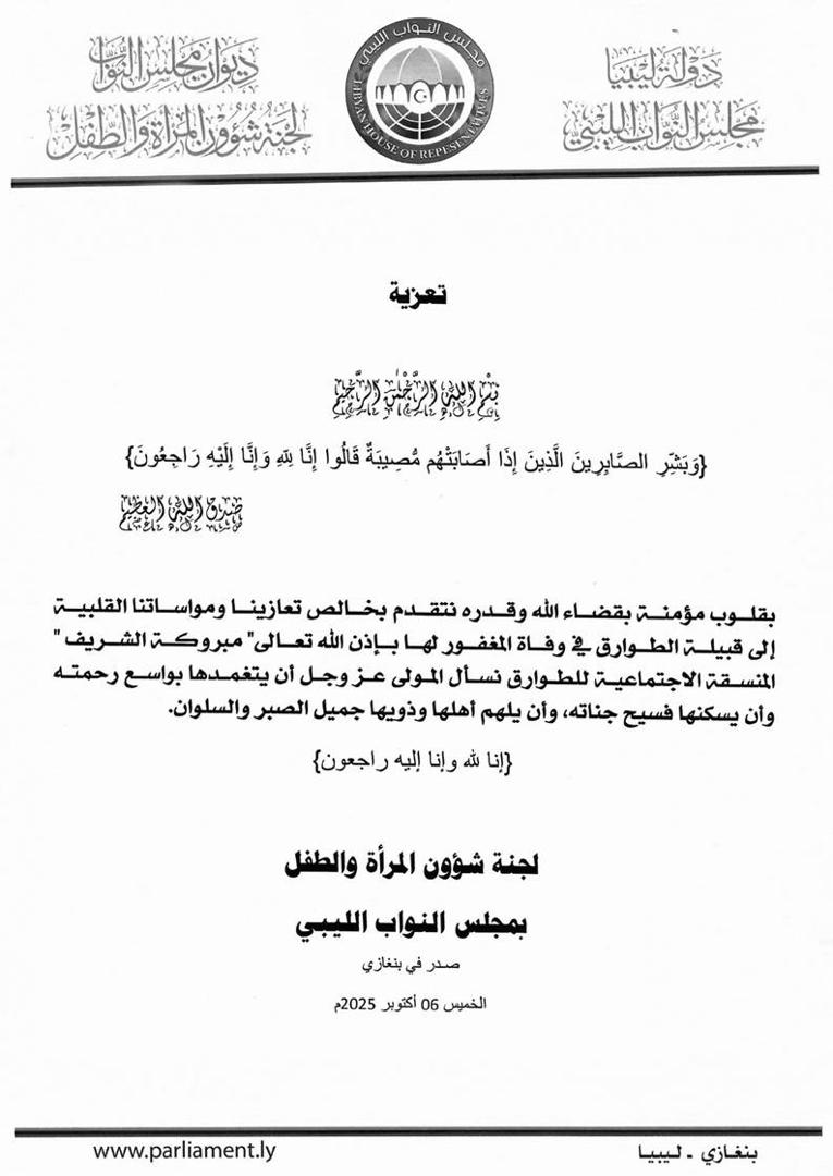 لجنة شؤون المرأة والطفل تقدم التعازي إلى قبيلة الطوارق في وفاة المغفور لها بإذن الله تعالى المنسق الاجتماعي للقبيلة” مبروكة الشريف