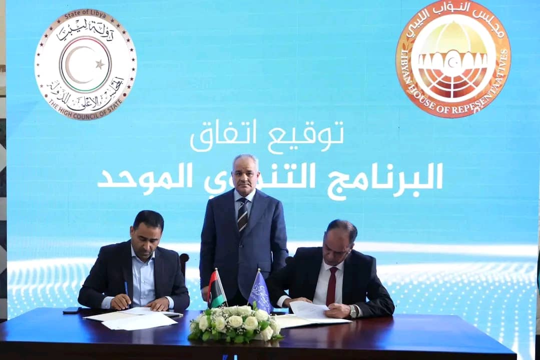 رحب مصرف ليبيا المركزي بتوقيع اتفاق البرنامج التنموي الموحد بين مجلس النواب والمجلس الأعلى للدولة، معتبراً إياه خطوة وطنية مهمة نحو تعزيز الاستقرار المالي وتوحيد جهود التنمية في مختلف مناطق البلاد وأكد المصرف في بيان دعمه الكامل لهذا الاتفاق الذي يجسد روح المسؤولية المشتركة، ويعزز مبادئ الشفافية والحوكمة، ويضع إطاراً واضحاً لتنظيم وتوحيد قنوات الإنفاق والصرف على مشروعات التنمية