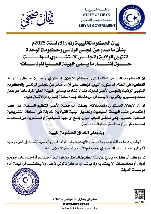 من جهتها، أعلنت الحكومة الليبية برئاسة الدكتور أسامة حماد في بيان رسمي رفضها المطلق لتشكيل هذه الهيئة، معتبرة أنها “تجاوز صارخ للصلاحيات الدستورية