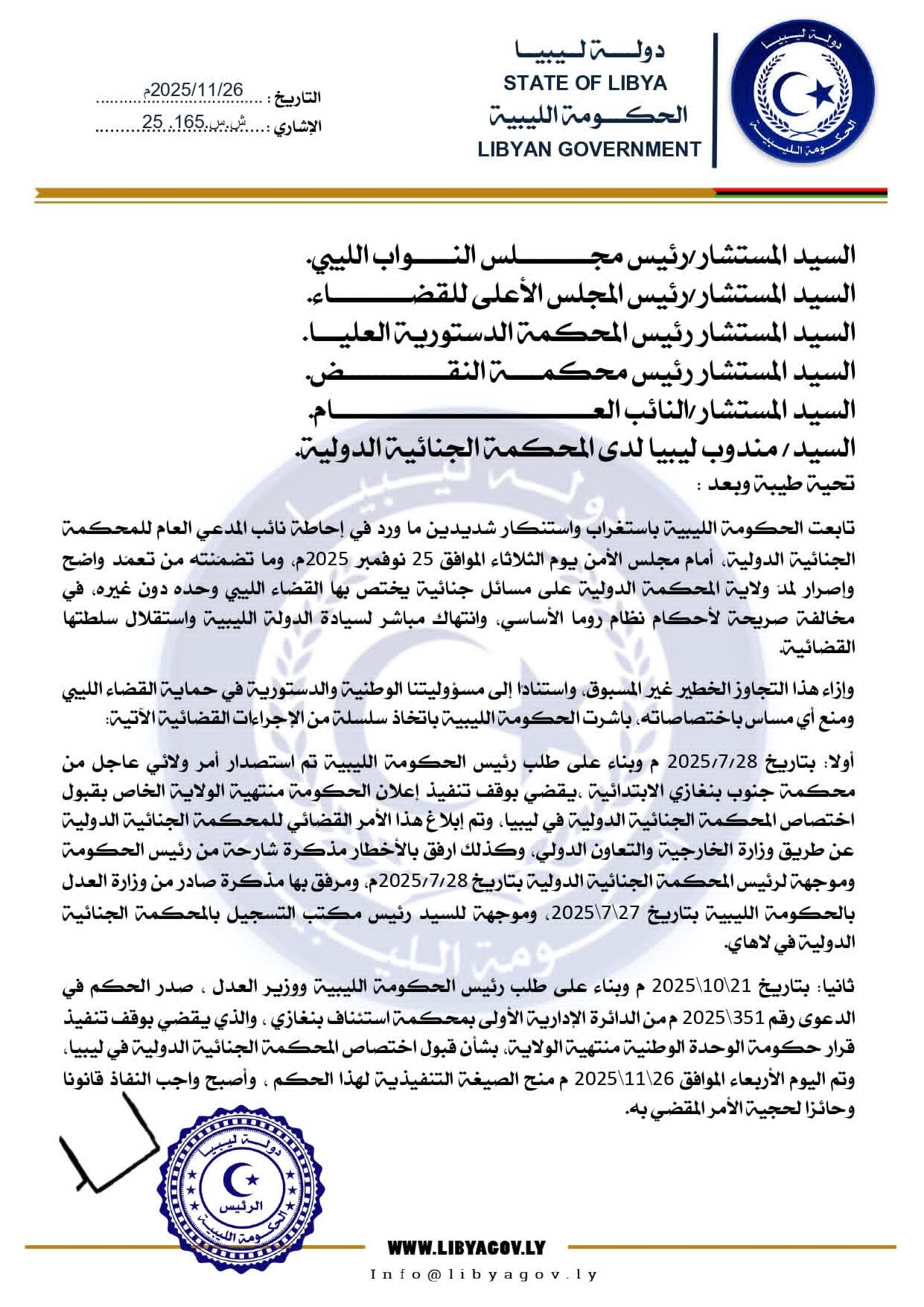 أصدرت محكمة استئناف بنغازي الصيغة التنفيذية لحكمها الذي قضت به في شهر أكتوبر الماضي والذي يقضي بوقف تنفيذ قرار رئيس حكومة الوحدة الوطنية عبد الحميد الدبيبة بشأن موافقة ليبيا على ممارسة اختصاصات المحكمة الجنائية الدولية للتحقيق في الأحداث التي شهدتها البلاد خلال الفترة من العام 2011 حتى 2027