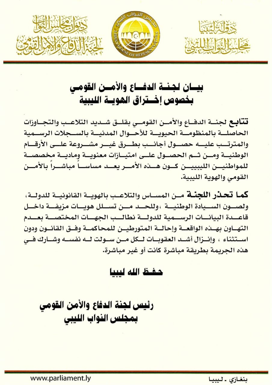 حذرت لجنة الدفاع والأمن القومي بمجلس النواب من التلاعب والتجاوزات بالسجلات الرسمية للمنظومة الحيوية للأحوال المدنية والمترتب عليها حصول أجانب بطرق غير مشروعة على الأرقام الوطنية، الأمر الذي يهدد الأمن القومي الليبي