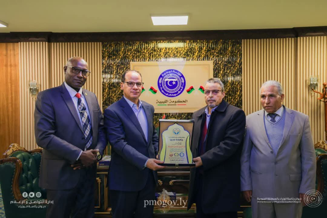 استقبل نائب رئيس الحكومة الليبية ووزير الدفاع، الدكتور إحميد حومة وفد جامعة سبها، الذي ضمّ رئيس الجامعة الدكتور مسعود الرقيق، وعميد كلية التمريض الدكتور صالح المنوني، ورئيس اللجنة العلمية للمؤتمر العلمي الأول للعلوم الطبية الدكتور إبراهيم شناف وخلال اللقاء، قام وفد الجامعة بتكريم نائب رئيس الحكومة بدرعٍ تقديري، تقديرًا لرعايته ودعمه للمؤتمر العلمي الأول للعلوم الطبية، الذي أُقيم خلال شهر نوفمبر 2025 بمدرج اللغات بمدينة سبها، وذلك ضمن مبادرة المشير «معًا من أجل الجنوب» وأعرب وفد جامعة سبها عن بالغ شكرهم وتقديرهم لمبادرة المشير «معًا من أجل الجنوب»، مؤكدين أنها تمثل ركيزة أساسية في دعم وتعزيز البحث العلمي وبناء المعرفة، ومثمّنين في السياق ذاته الدور المحوري الذي يضطلع به نائب رئيس الحكومة في دعم قطاع التعليم العالي والبحث العلمي، وحرصه المستمر على رعاية الأنشطة العلمية والطبية، بما يسهم في الارتقاء بالخدمات الصحية وتعزيز المسار البحثي بالمنطقة الجنوبية