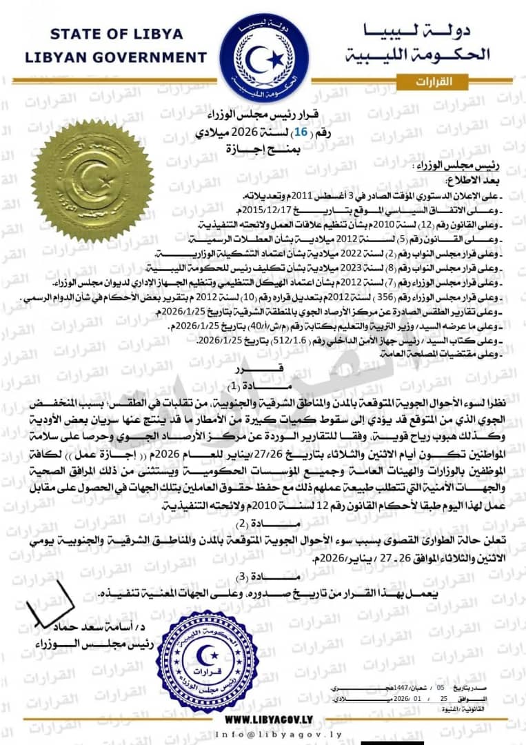 أصدر رئيس الحكومة الليبية أسامة حماد الأحد القرار رقم (16) لسنة 2026م، بشأن منح يومي الاثنين والثلاثاء المقبلين إجازة رسمية تحسباً لسوء الأحوال الجوية المتوقعة ويسرى قرار الحكومة على الوزارات والهيئات العامة والمؤسسات الحكومية، باستثناء المرافق الصحية والجهات الأمنية التي تتطلب طبيعة عملها التواجد للتعامل مع حالات الطوارئ كما تضمن إعلان حالة الطوارئ القصوى بالمدن والمناطق الشرقية والجنوبية خلال ذات الفترة