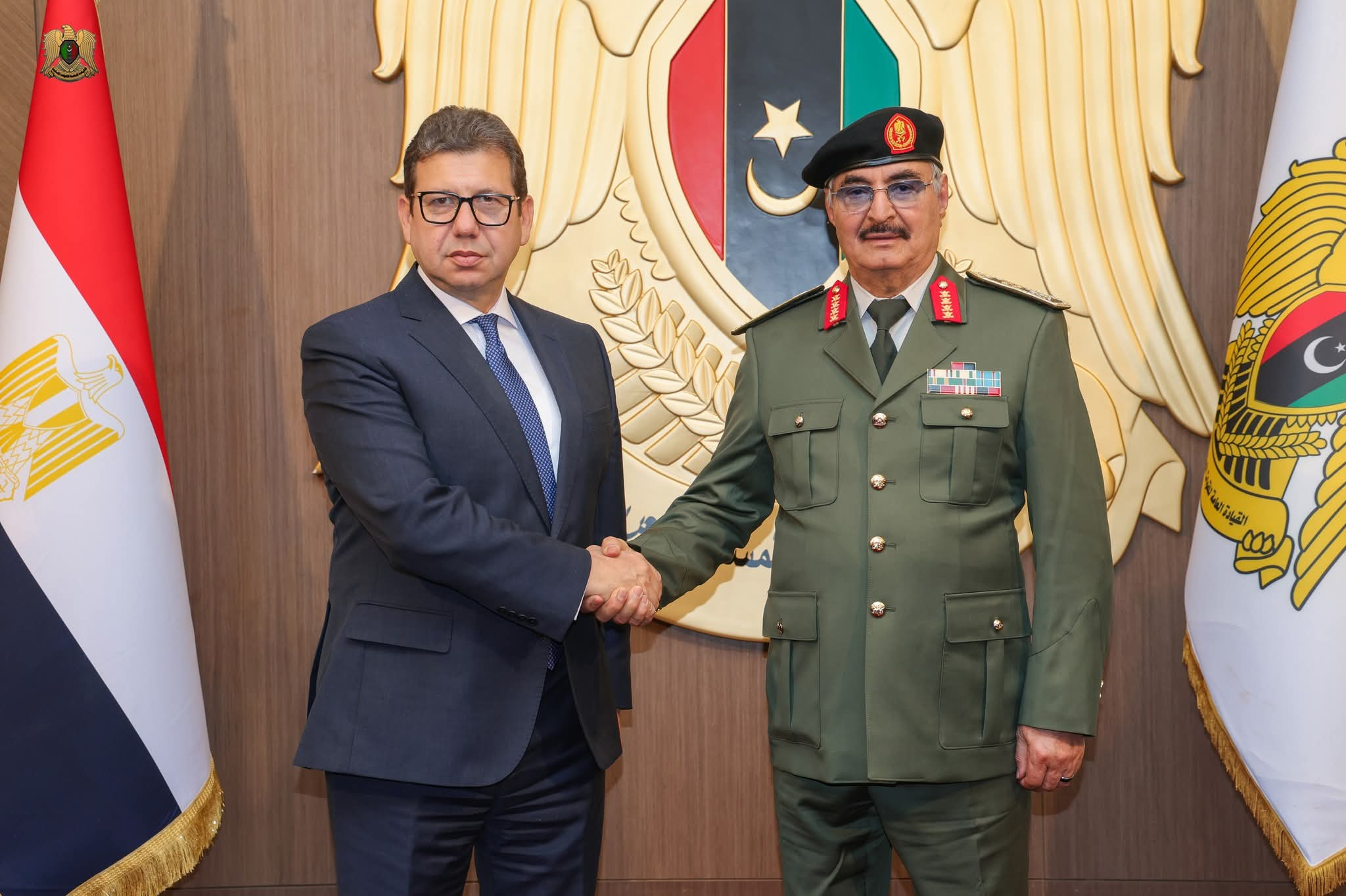 القائد العام للقوات المسلحة، المشير أركان حرب "خليفة أبوالقاسم حفتر"، يستقبل في مكتبه بمقرّ القيادة العامة بمدينة بنغازي، رئيس المخابرات العامة المصرية، اللواء "حسن رشاد"، والوفد المرافق له، بحضور رئيس الأركان العامة للقوات المسلحة، الفريق أول ركن "خالد حفتر" وكان في استقبال رئيس المخابرات العامة المصرية والوفد المرافق له، فور وصولهم إلى مدينة بنغازي، نائب القائد العام للقوات المسلحة، الفريق أول ركن "صدام حفتر"