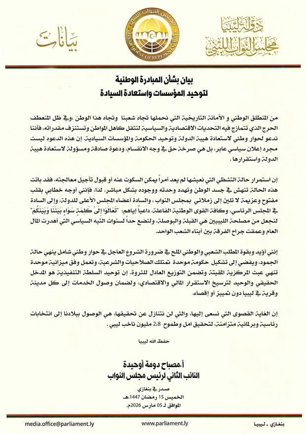 بيان النائب الثاني لرئيس مجلس النواب صباح أوحيدة بشأن المبادرة الوطنية لتوحيد المؤسسات واستعادة السيادة